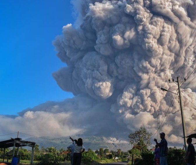 3月2日,人們在印度尼西亞北蘇門答臘省卡羅觀看噴發(fā)的錫納朋火山。新華社發(fā)(森比林?jǐn)z)