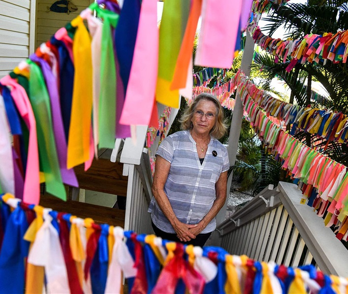 人民網(wǎng)訊 據(jù)媒體3月10日?qǐng)?bào)道,美國佛羅里達(dá)州安娜瑪麗亞島,67歲的凱西·托拜厄斯(Cathy Tobias)在院子里系上絲帶,紀(jì)念新冠肺炎遇難者?,F(xiàn)在她的院子里有超過3萬條絲帶,從露臺(tái)、樓梯到陽臺(tái)都系滿了五顏六色的帶子,每一條代表著一位死于新冠肺炎的佛州人。