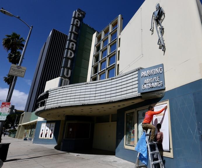3月15日,美國加利福尼亞州洛杉磯一家影院的員工為重新營業(yè)做準(zhǔn)備。