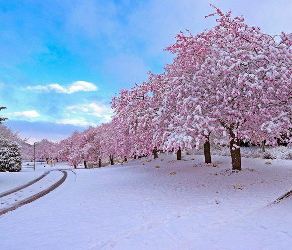 當?shù)貢r間4月6日,德國錫根,當?shù)赜瓉斫笛?,春雪里的櫻花美如畫卷。(圖片來源:東方IC)