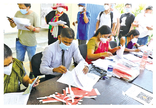 圖為斯里蘭卡衛(wèi)生部官員勘驗疫苗注射相關文件。