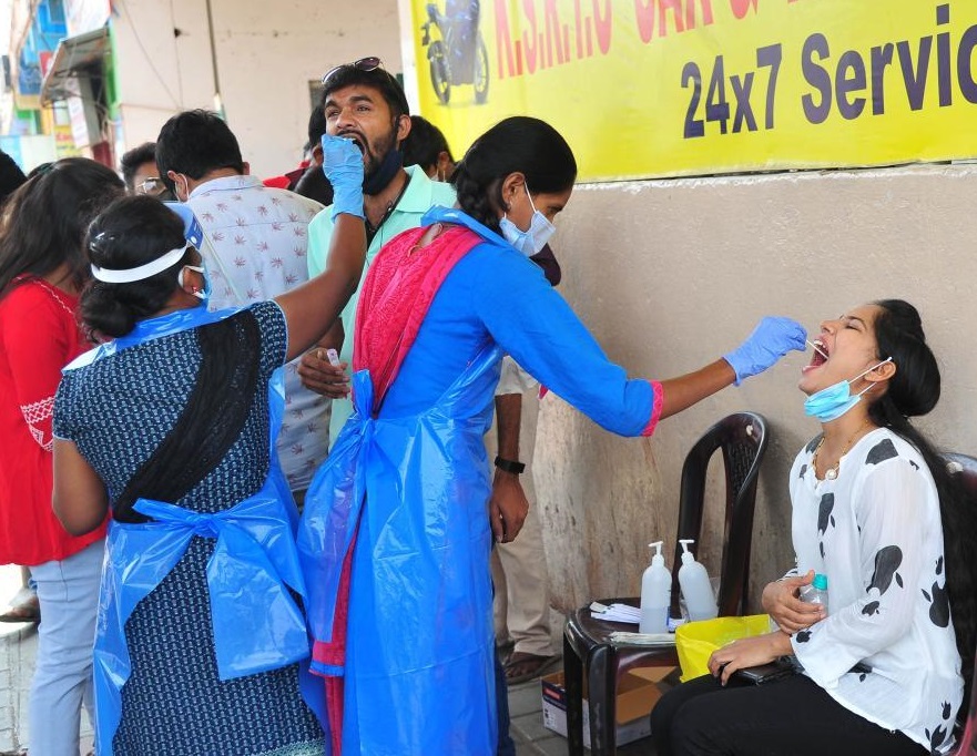 4月11日,人們?cè)谟《劝嗉恿_爾的一個(gè)公交站接受新冠病毒檢測(cè)取樣。