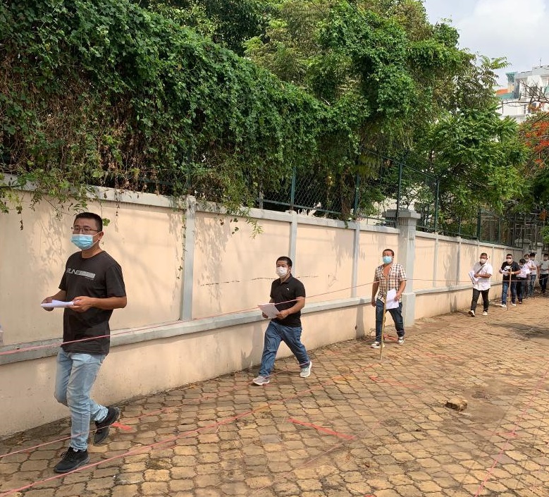 4月10日,在柬埔寨金邊的王家軍總醫(yī)院,在柬中國公民排隊等待接種新冠疫苗。