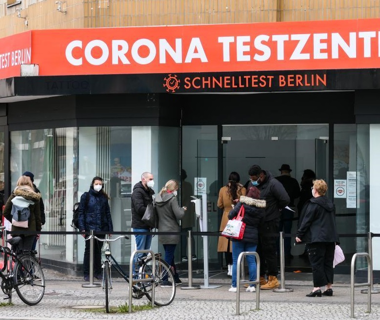 4月12日,在德國首都柏林,人們在一處新冠檢測點(diǎn)外排隊等候。