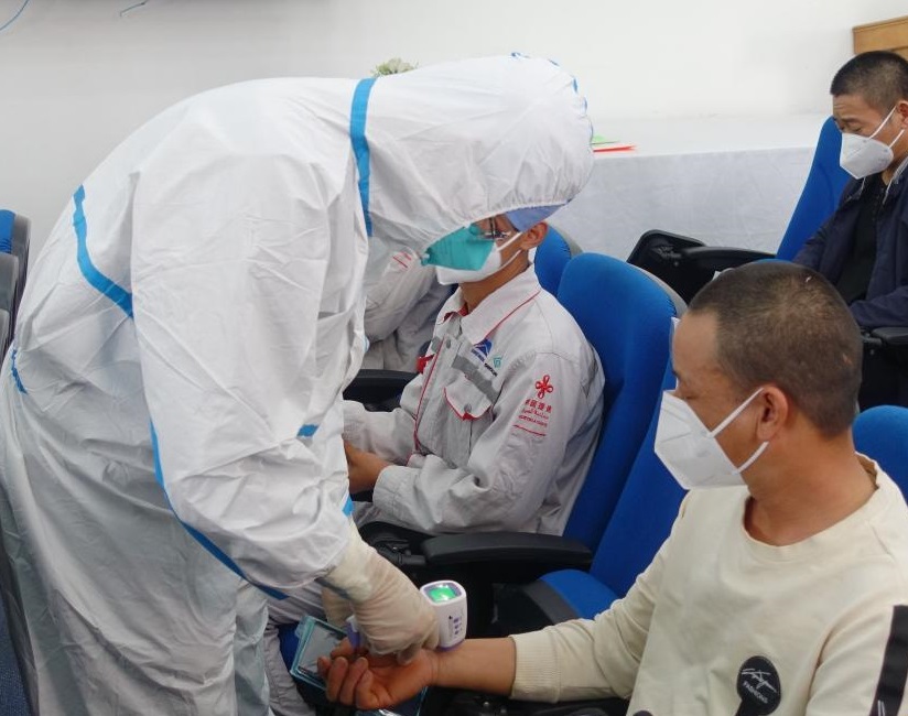 4月14日,在突尼斯首都突尼斯市,工作人員為一名準備接種新冠疫苗的中國公民檢查體溫。