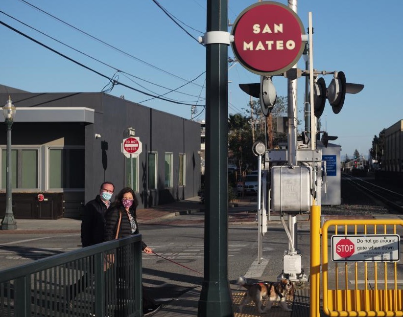 4月18日,人們走過美國加利福尼亞州北部小城圣馬特奧的一個路口。