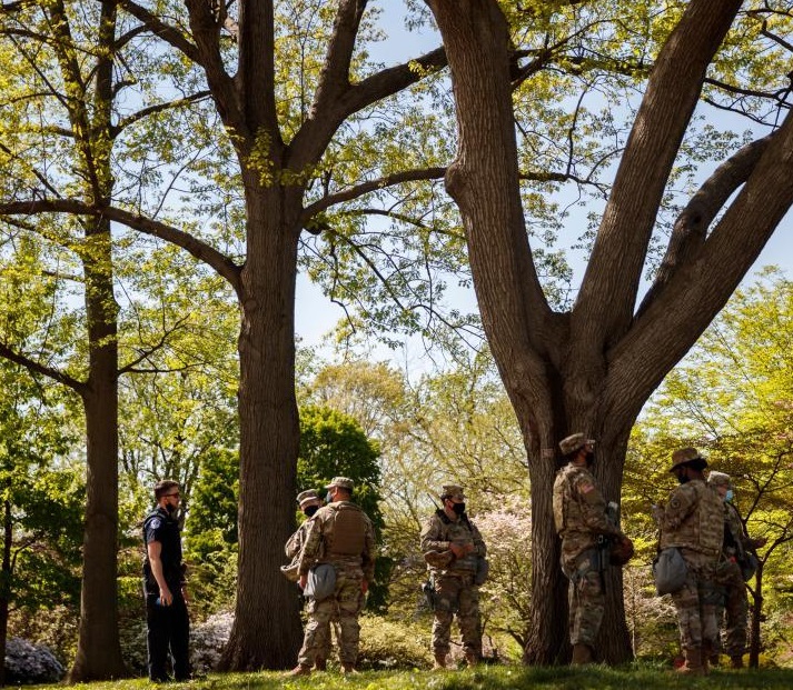 4月20日,在美國(guó)首都華盛頓,國(guó)民警衛(wèi)隊(duì)成員在國(guó)會(huì)附近警戒。