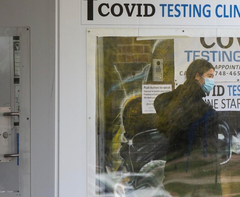 4月22日,在加拿大多倫多的一處新冠病毒檢測點,一名戴口罩的女子等候檢測。