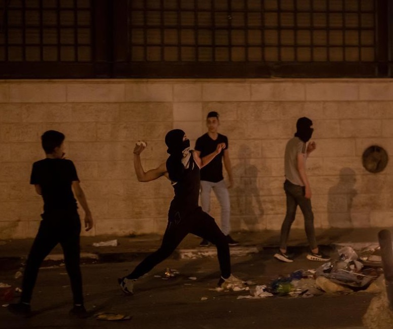 4月24日,一名巴勒斯坦示威者在約旦河西岸城市伯利恒向以色列士兵投擲石塊。