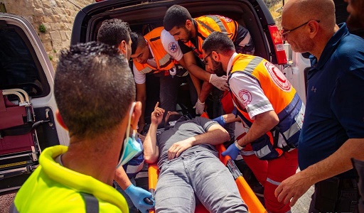 5月10日,一名在耶路撒冷老城圣殿山(穆斯林稱“尊貴禁地”)沖突中受傷的巴勒斯坦示威者被送醫(yī)救治。新華社/基尼圖片社