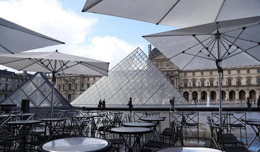 5月19日,法國(guó)巴黎盧浮宮博物館旁的餐館戶外區(qū)域準(zhǔn)備迎客。新華社記者高靜攝