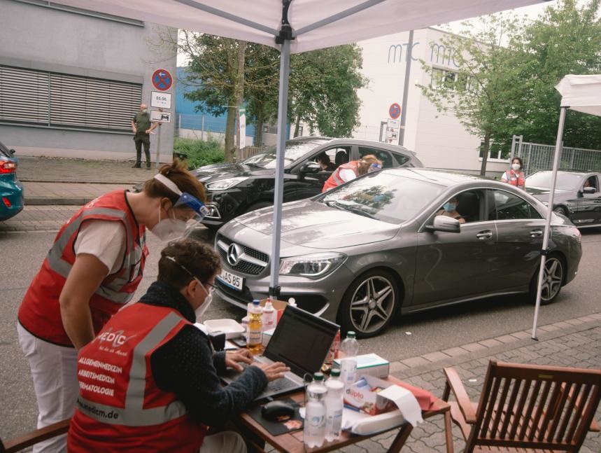 6月5日,德國梅爾布施的工作人員在一處“得來速”式新冠疫苗接種點(diǎn)工作。