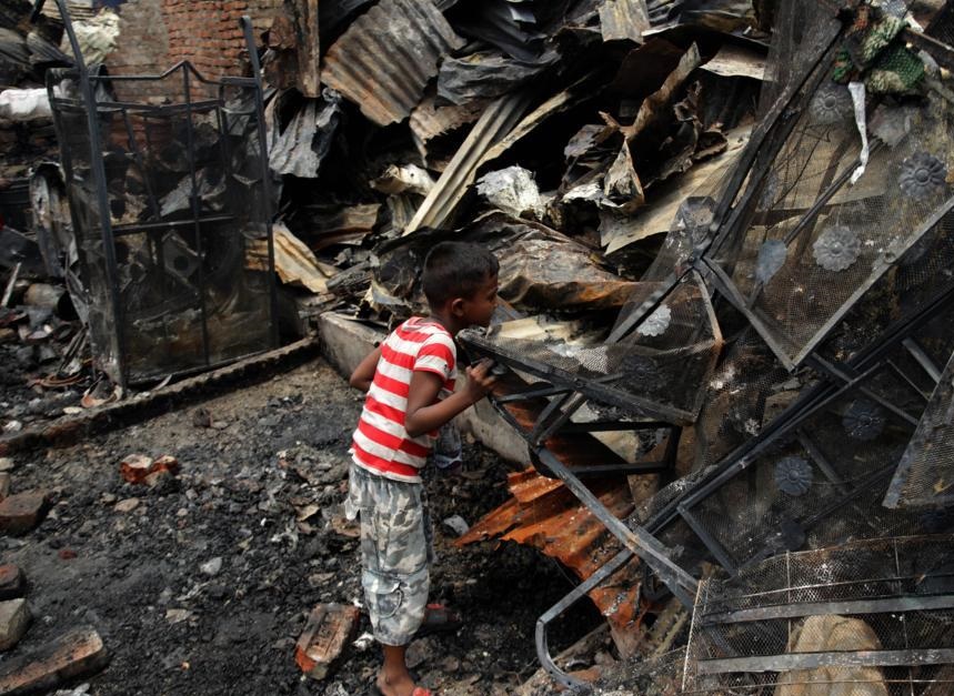 6月7日,一名兒童在孟加拉國首都達卡發(fā)生火災(zāi)的貧民窟廢墟中尋找個人物品。
