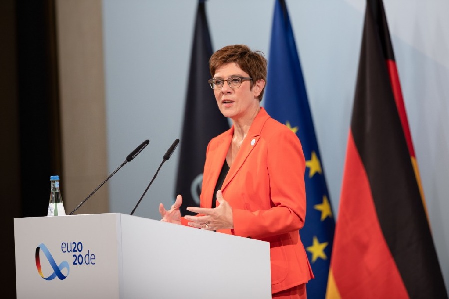 2020年8月26日,在德國(guó)首都柏林,德國(guó)國(guó)防部長(zhǎng)克蘭普-卡倫鮑爾出席歐盟國(guó)防部長(zhǎng)非正式會(huì)議后的新聞發(fā)布會(huì)。(新華社發(fā),德國(guó)聯(lián)邦國(guó)防軍供圖)