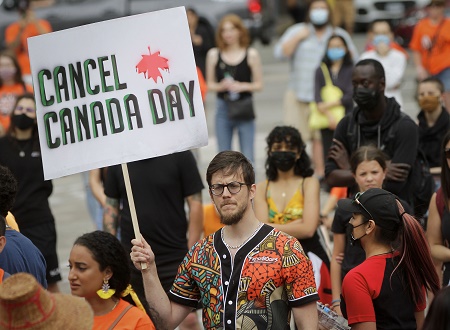 當(dāng)天是加拿大日,上千名抗議者在溫哥華集會(huì),悼念加拿大在強(qiáng)制“同化”原住民過程中遭到殘害的兒童,呼吁取消加拿大日的慶?;顒?dòng)。