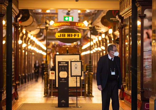 7月5日,一名男子戴著口罩站在澳大利亞悉尼市中心的一家商場門口。