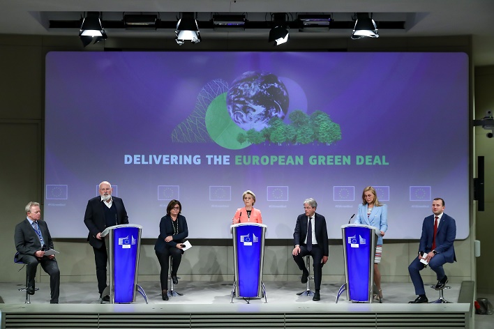 7月14日,歐盟委員會主席馮德萊恩(左四)、第一副主席蒂默曼斯(左二)等在比利時布魯塞爾出席應對氣候變化一攬子計劃提案發(fā)布會。