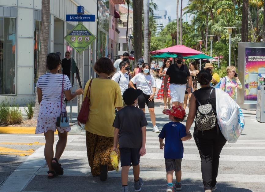 8月6日,人們?cè)诿绹?guó)佛羅里達(dá)州邁阿密-戴德縣的一個(gè)商業(yè)區(qū)游覽。