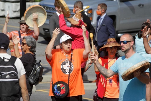 8月10日,在加拿大北溫哥華“圣保羅印第安寄宿學(xué)校”舊址,人們在新聞發(fā)布會(huì)后擊鼓、唱歌。加拿大不列顛哥倫比亞省的三個(gè)原住民部族10日宣布,將對位于北溫哥華的“圣保羅印第安寄宿學(xué)?!迸f址展開調(diào)查。(新華社發(fā),梁森攝)