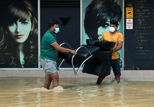 11月10日,在斯里蘭卡尼甘布,人們?cè)诜e水中搬運(yùn)家具。