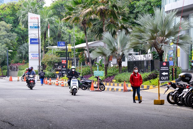 2月17日,人們佩戴口罩經(jīng)過(guò)印度尼西亞首都雅加達(dá)的一棟寫(xiě)字樓前。