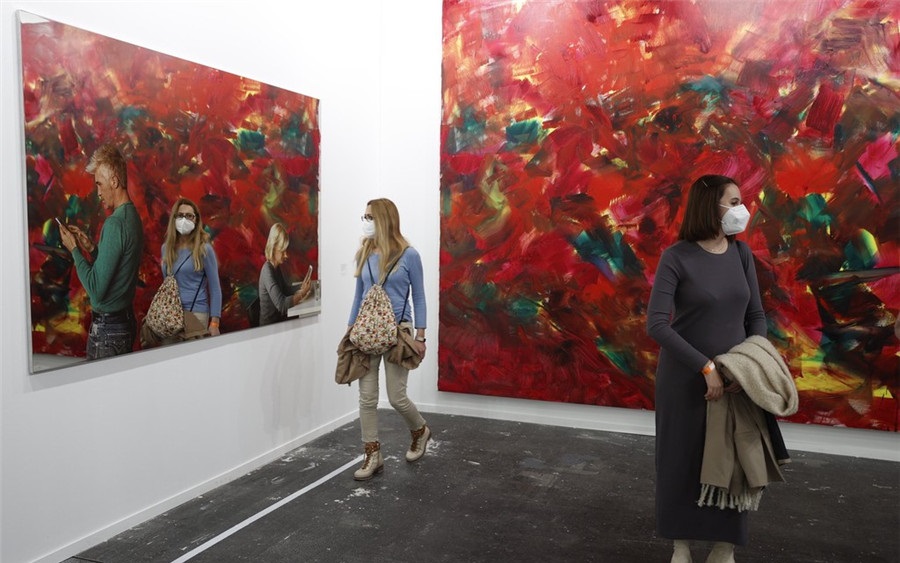 人民網(wǎng)訊 當(dāng)?shù)貢r間2月27日,西班牙馬德里,2022馬德里當(dāng)代藝術(shù)博覽會的最后一天,參觀者在欣賞藝術(shù)品。