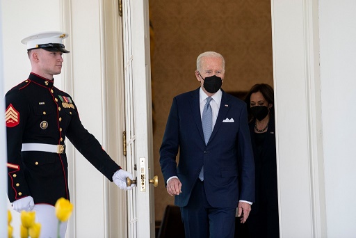 4月11日,美國總統(tǒng)拜登(左二)準(zhǔn)備在華盛頓白宮發(fā)表講話。新華社記者劉杰攝