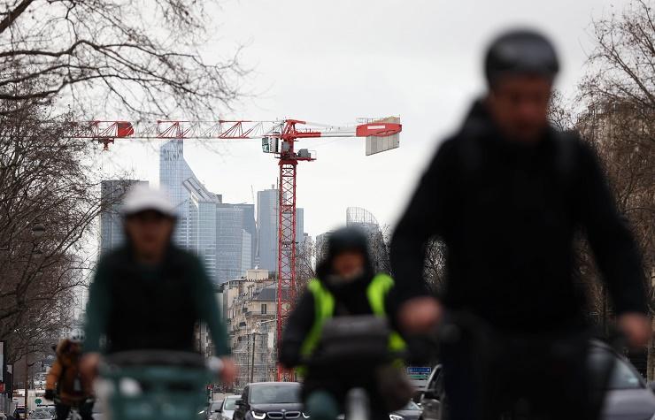 這是2月1日在法國巴黎拍攝的拉德芳斯商務(wù)區(qū)及塔吊。新華社記者 高靜 攝