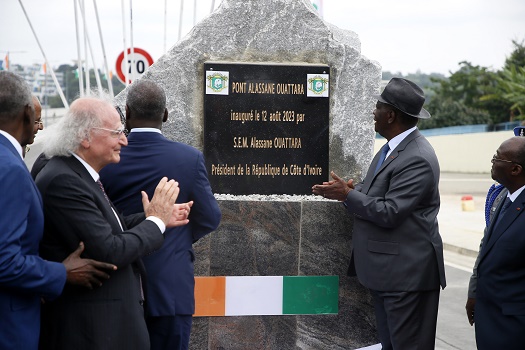 12日,在科特迪瓦經(jīng)濟首都阿比讓,科特迪瓦總統(tǒng)瓦塔拉(右二)為科科迪橋揭幕。新華社發(fā)(伊萬·宋攝)