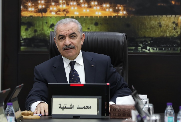 26日,巴勒斯坦總理阿什提耶在約旦河西岸城市拉姆安拉舉行的政府工作會(huì)議發(fā)表講話,宣布巴勒斯坦政府辭職。新華社發(fā)(艾曼·諾巴尼攝)