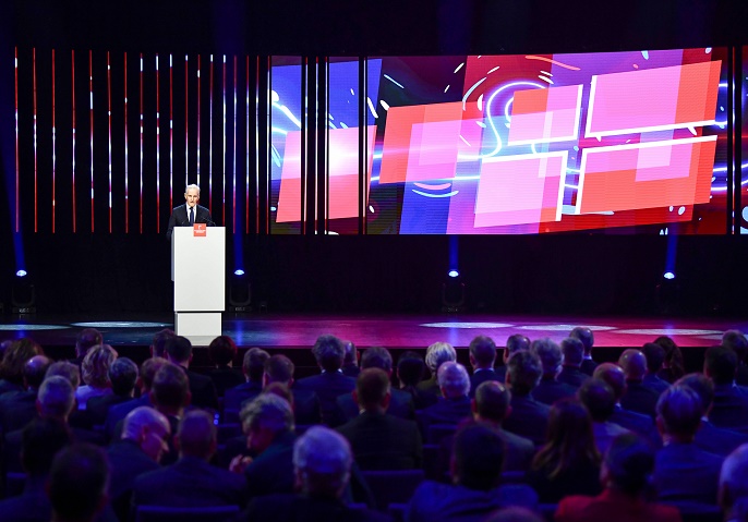 4月21日,挪威首相斯特勒在德國(guó)漢諾威工業(yè)博覽會(huì)開(kāi)幕式上致辭。挪威是今年展會(huì)主賓國(guó)。 新華社記者 任鵬飛 攝