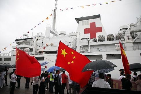 10月7日,中國(guó)海軍“和平方舟”號(hào)醫(yī)院船抵達(dá)喀麥隆杜阿拉港。 新華社發(fā)(劉志磊攝)
