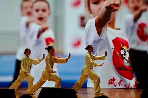 莫斯科體育實驗學(xué)校體教中心學(xué)生表演武術(shù)。