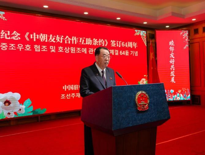 7月9日,在朝鮮首都平壤,朝鮮最高人民會議常任委員會副委員長姜潤石在紀念《中朝友好合作互助條約》簽訂64周年招待會上致辭。新華社發(fā)(中國駐朝鮮大使館供圖)