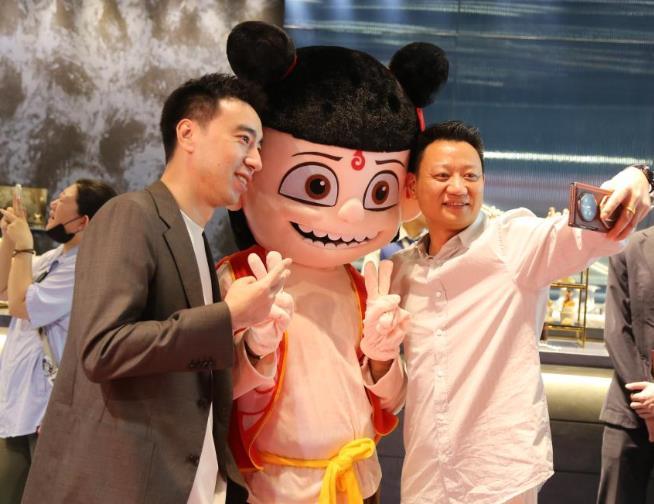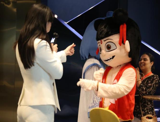 7月15日,在阿聯(lián)酋迪拜的首映儀式現(xiàn)場(chǎng),人們與《哪吒2》主題人偶互動(dòng)。新華社記者 溫新年 攝