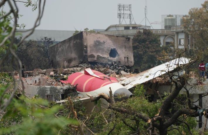 6月13日,在印度古吉拉特邦艾哈邁達巴德,幾名男子站在客機殘骸旁。新華社發(fā)