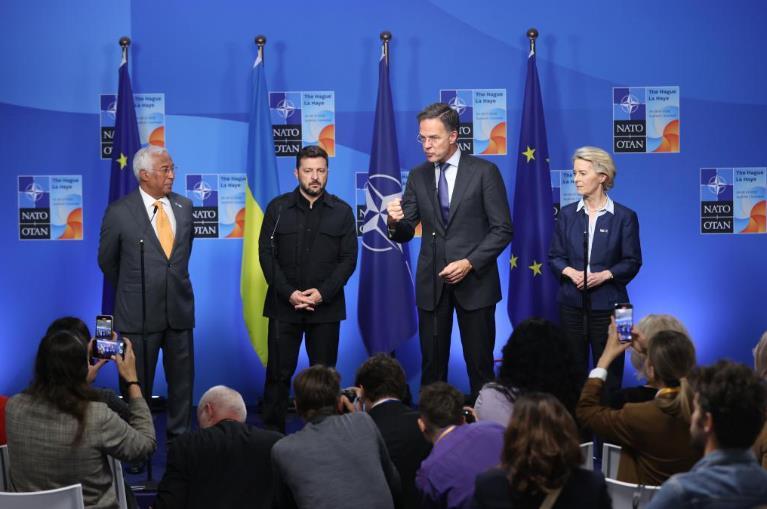 6月24日,在荷蘭海牙,歐洲理事會(huì)主席科斯塔、烏克蘭總統(tǒng)澤連斯基、北約秘書長(zhǎng)呂特和歐盟委員會(huì)主席馮德萊恩(從左至右)在北約峰會(huì)期間共見記者。新華社記者 趙丁喆 攝