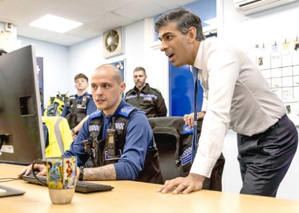 當(dāng)?shù)貢r間2024年4月10日,英國蘇塞克斯郡,時任英國首相蘇納克在霍舍姆警察局觀看監(jiān)控錄像,表示政府將遏制商店盜竊犯罪。 CFP供圖