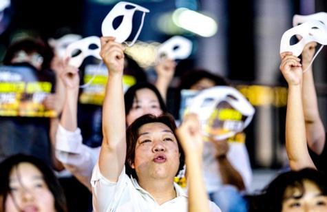 圖為當?shù)貢r間2024年8月30日,韓國首爾,抗議者舉行示威,反對深度偽造色情片,活動人士佩戴面具。 CFP供圖