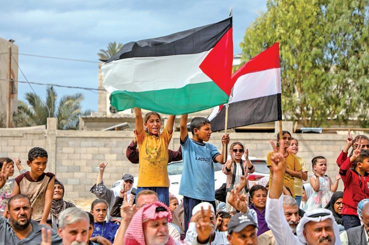 10月9日,在加沙地帶中部代爾拜拉赫,巴勒斯坦民眾在獲悉加沙停火協(xié)議的消息后慶祝。 新華社發(fā)(里澤克·阿卜杜勒賈瓦德攝)