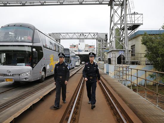 火車輪渡南港派出所副所長(zhǎng)張曉攜民警戈丹巡邏輪渡碼頭。張新新 攝