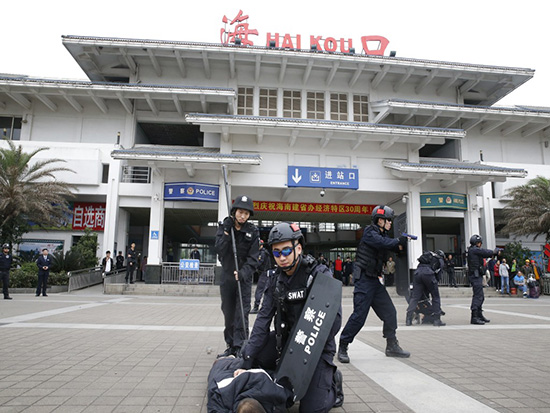 當(dāng)天上午10時(shí),海口車站站前廣場(chǎng),忽然沖入1名“暴徒”手持砍刀“追砍”群眾。