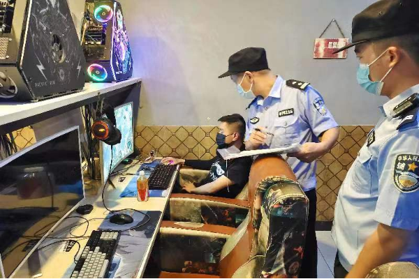 暑假以來(lái),浙江省臺(tái)州市公安局椒江分局加強(qiáng)對(duì)網(wǎng)吧的安全檢查,重點(diǎn)檢查網(wǎng)吧上網(wǎng)者是否實(shí)名登記、是否接納未成年人上網(wǎng)、安全制度是否落實(shí)到位等情況,消除各類安全隱患,規(guī)范網(wǎng)吧經(jīng)營(yíng)秩序。圖為7月27日,下陳派出所民警在一家網(wǎng)吧對(duì)上網(wǎng)人員的身份進(jìn)行檢查登記。