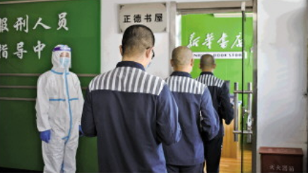 圖為鄧甲龍(左一)組織罪犯購書。 受訪者供圖