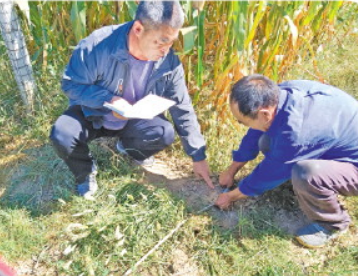 馬建新現場測量土地,調解田某5兄弟之間土地糾紛。