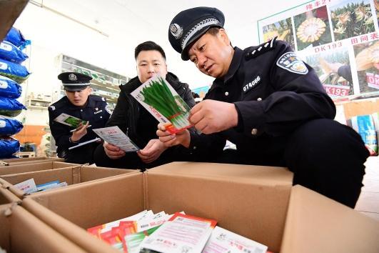 圖為2月20日,甘肅省臨澤縣公安局城關(guān)派出所民輔警到轄區(qū)農(nóng)資經(jīng)營點(diǎn),對(duì)種子、化肥、農(nóng)膜、農(nóng)藥等農(nóng)用物資進(jìn)行全覆蓋檢查。法治日?qǐng)?bào)全媒體通訊員 安學(xué)海 攝
