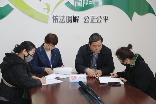 11月17日,河南省開封市宋都人民調(diào)解委員會調(diào)解員與律師聯(lián)手化解一起糾紛,當(dāng)事雙方現(xiàn)場簽訂調(diào)解協(xié)議。 法治日報全媒體記者 趙紅旗 攝