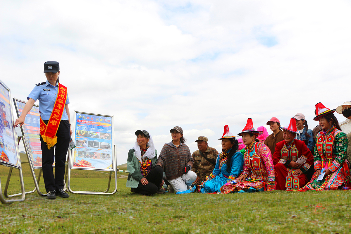 6月19日,甘肅省肅南縣公安局禁毒大隊民警走進牧區(qū)開展禁毒宣傳,民警用“雙語”面對面向群眾講解毒品的種類、性狀以及危害性,提高牧區(qū)群眾禁毒意識。