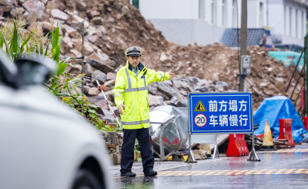 近日,湖北省長陽土家族自治縣公安局高家堰派出所民警冒雨在轄區(qū)道路塌方維修路段執(zhí)勤,提醒過往車輛減速慢行,確保通行安全。法治日報全媒體記者 劉歡 通訊員 胡燦 攝