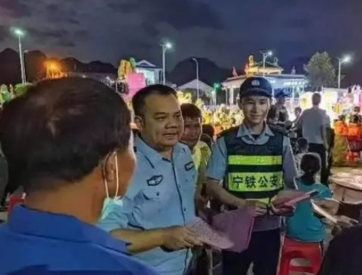 圖為2021年,永安派出所民警李燮(左二)聯(lián)合寧鐵公安在永安高鐵站進(jìn)行安全防護(hù)宣傳。警方供圖